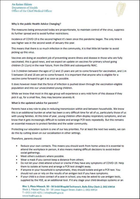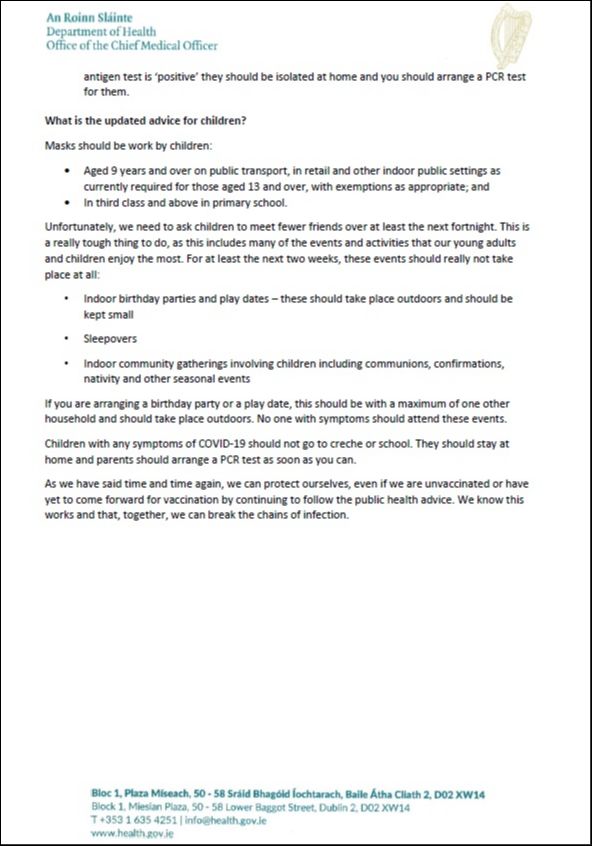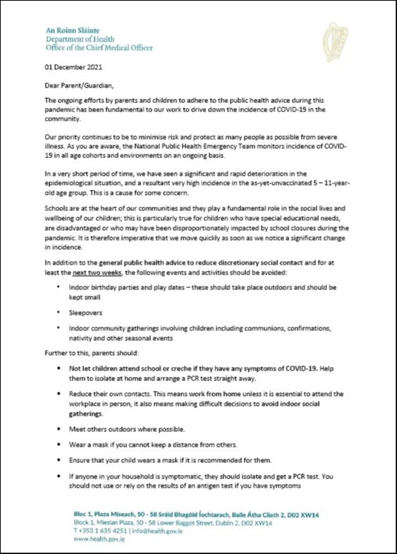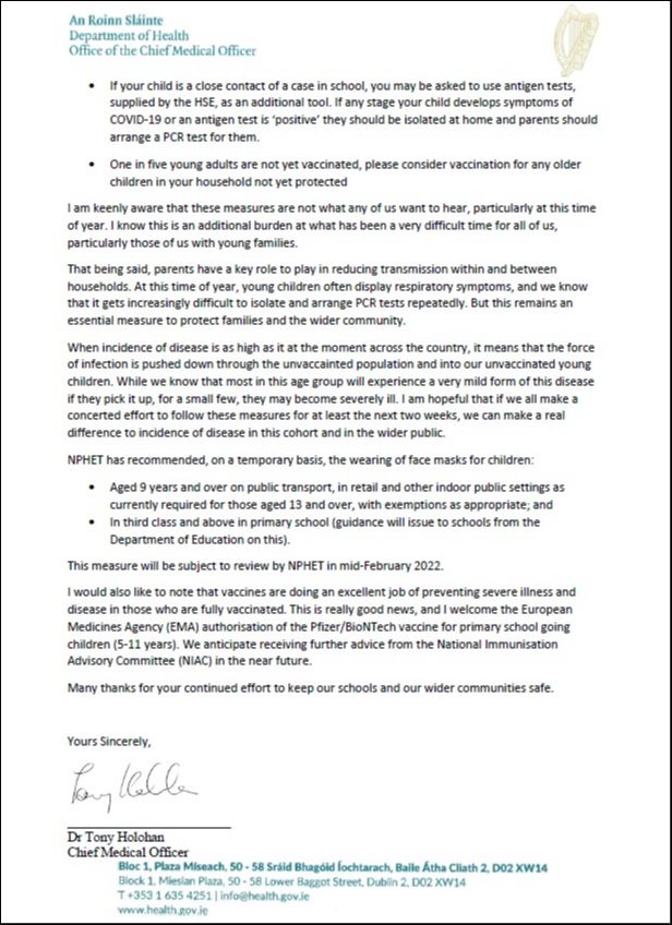 This is the letter as issued by the Chief Medical Officer, Mr Tony Holohan on the evening of 30th November 2021. It was emailed to everyone today, Wednesday, 1st December 2021. Please read through it carefully as it contains lots of helpful information.